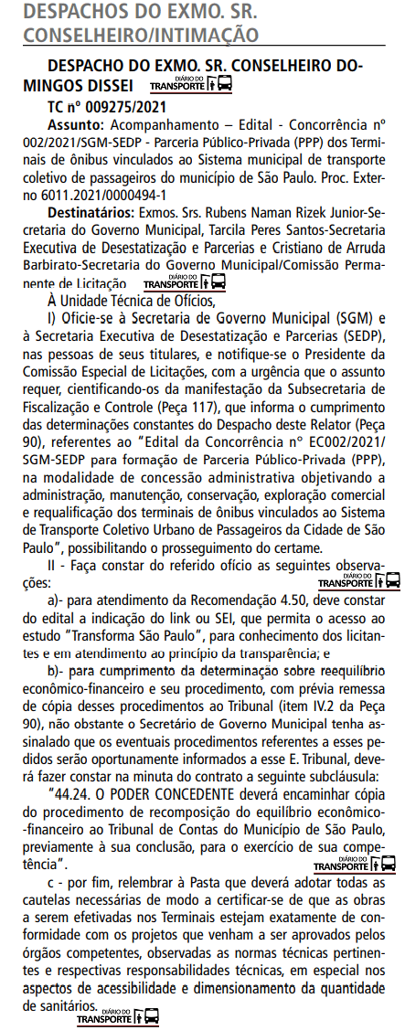 O portal de notícias “Diário do Transporte” repercutiu, nesta sexta-feira (27), a retomada da licitação dos terminais de ônibus pelo Tribunal de Contas do Município de São Paulo (TCMSP).